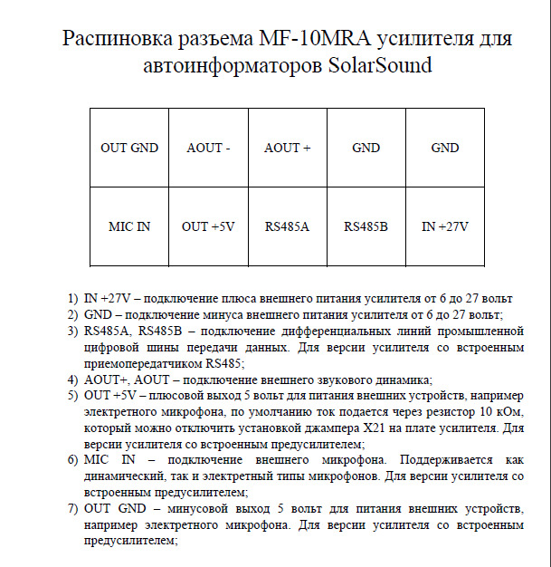 - Тема: Распиновка разъема MF-10MRA усилителя для автоинформаторов SolarSound